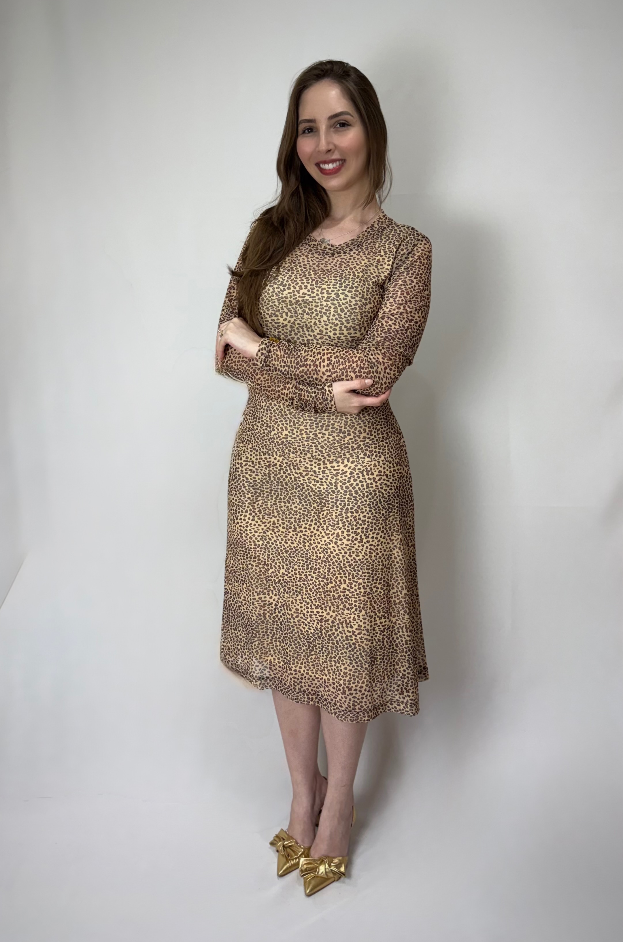 •Vestido •Tecido: tule de malha •Cor: estampado •Modelagem: evasê •Mangas longas •Possui forro avulso